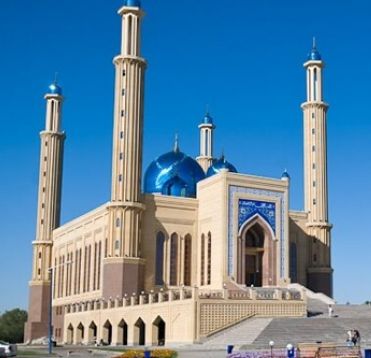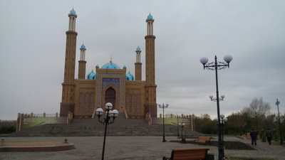 Самаладай жарқыраған биік шырақтар қаланың көркіне сән беріп тұрған еңселі мешіт
